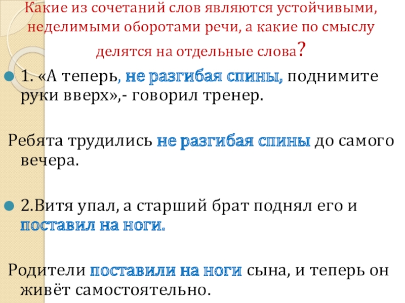 1. «А теперь, не разгибая спины, поднимите руки вверх»,- говорил тренер.
