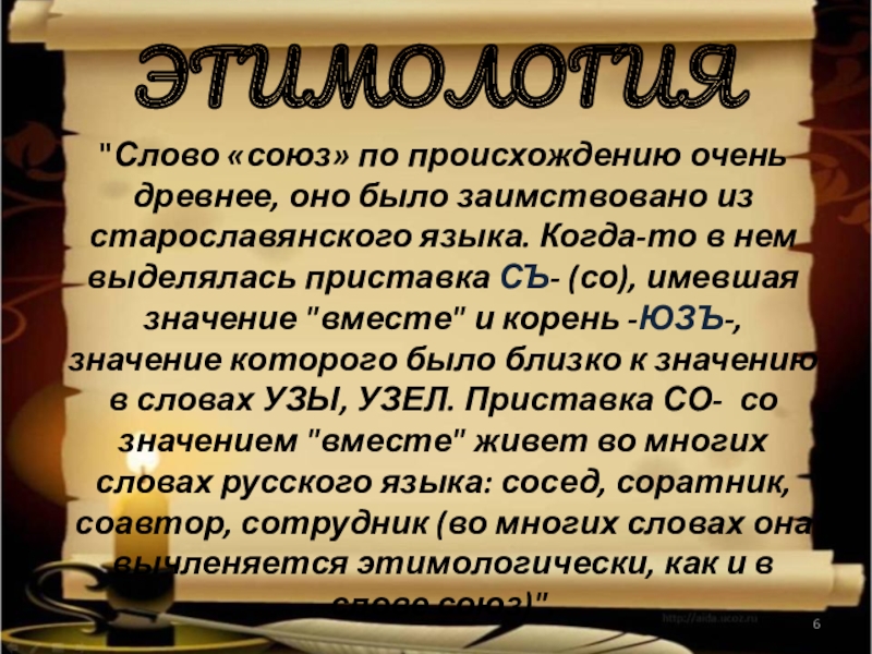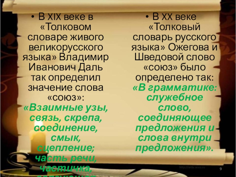 В XX веке «Толковый словарь русского языка» Ожегова и Шведовой слово «союз» было определено так: «В грамматике: служебное слово, соединяющее предложения и слова внутри предложения».