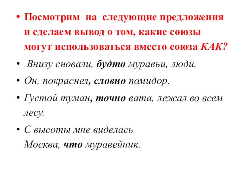 Слайд 12Посмотрим на следующие предложения и сделаем вывод о том, какие союзы