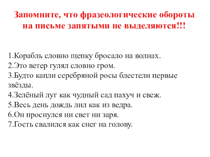 Слайд 15Запомните, что фразеологические обороты на письме запятыми не выделяются!!!