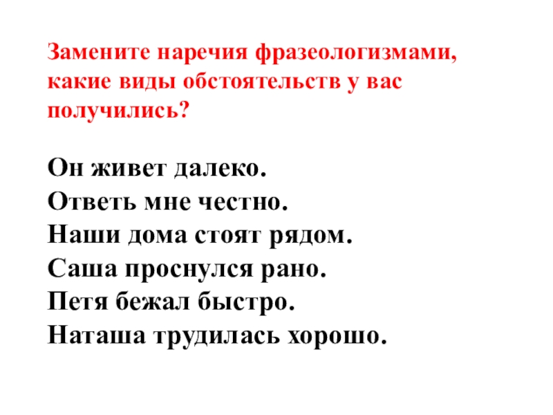 Слайд 17Замените наречия фразеологизмами, какие виды обстоятельств у вас получились?