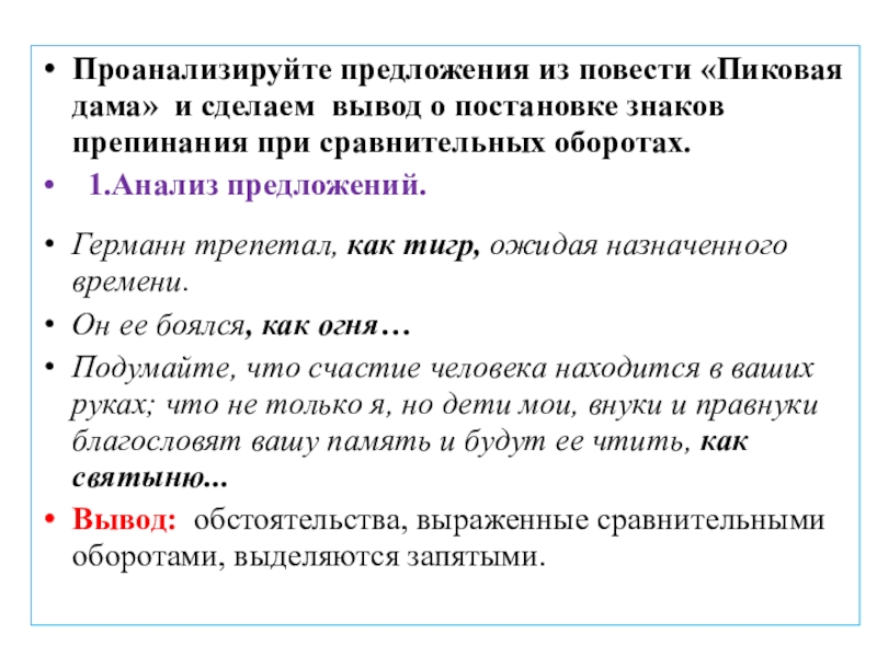 Слайд 8Проанализируйте предложения из повести «Пиковая дама» и сделаем вывод о постановке