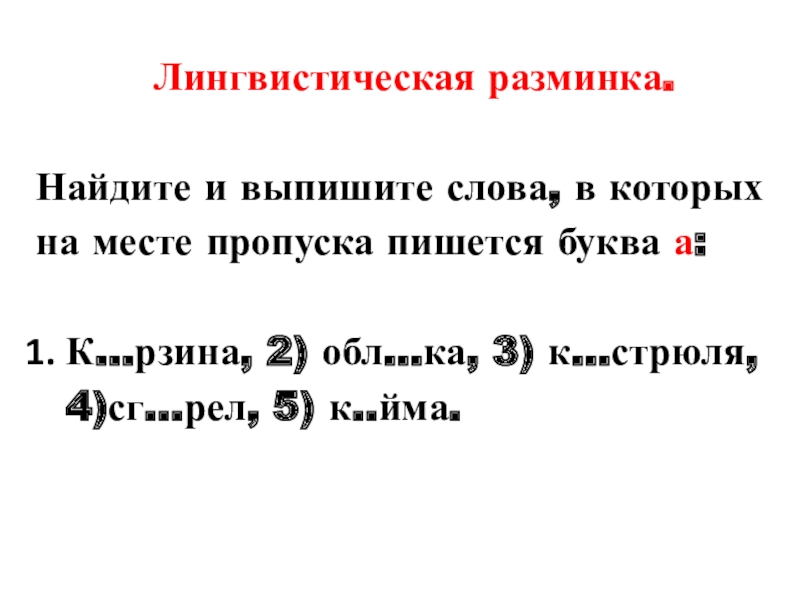 К…рзина, 2) обл…ка, 3) к…стрюля, 4)сг…рел, 5) к..йма.