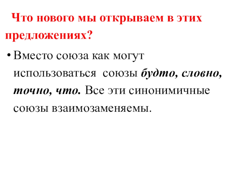 использоваться союзы будто, словно, точно, что. Все эти синонимичные союзы взаимозаменяемы.