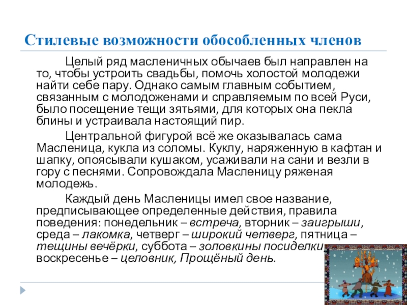 чтобы устроить свадьбы, помочь холостой молодежи найти себе пару. Однако самым главным событием, связанным с молодоженами и справляемым по всей Руси, было посещение тещи зятьями, для которых она пекла блины и устраивала настоящий пир.