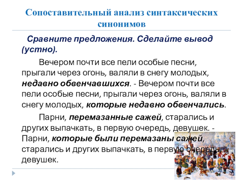 особые песни, прыгали через огонь, валяли в снегу молодых, недавно обвенчавшихся. - Вечером почти все пели особые песни, прыгали через огонь, валяли в снегу молодых, которые недавно обвенчались.