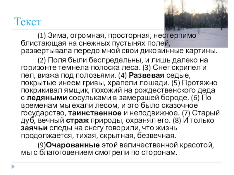 (2) Поля были беспредельны, и лишь далеко на горизонте темнела полоска леса. (3) Снег скрипел и пел, визжа под полозьями. (4) Развевая седые, покрытые инеем гривы, храпели лошади. (5) Протяжно покрикивал ямщик, похожий на рождественского деда с ледяными сосульками в замерзшей бороде. (6) По временам мы ехали лесом, и это было сказочное государство, таинственное и неподвижное. (7) Старый дуб, вечный страж природы, охранял его. (8) И только заячьи следы на снегу говорили, что жизнь продолжается, тихая, скрытная, безвечная.