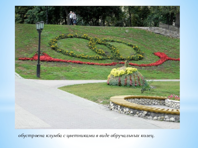 Слайд 18обустроена клумба с цветниками в виде обручальных колец.