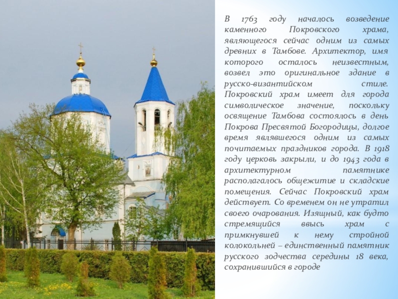 Слайд 10В 1763 году началось возведение каменного Покровского храма, являющегося сейчас одним