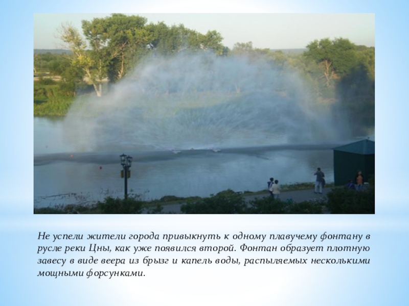 Слайд 22Не успели жители города привыкнуть к одному плавучему фонтану в русле