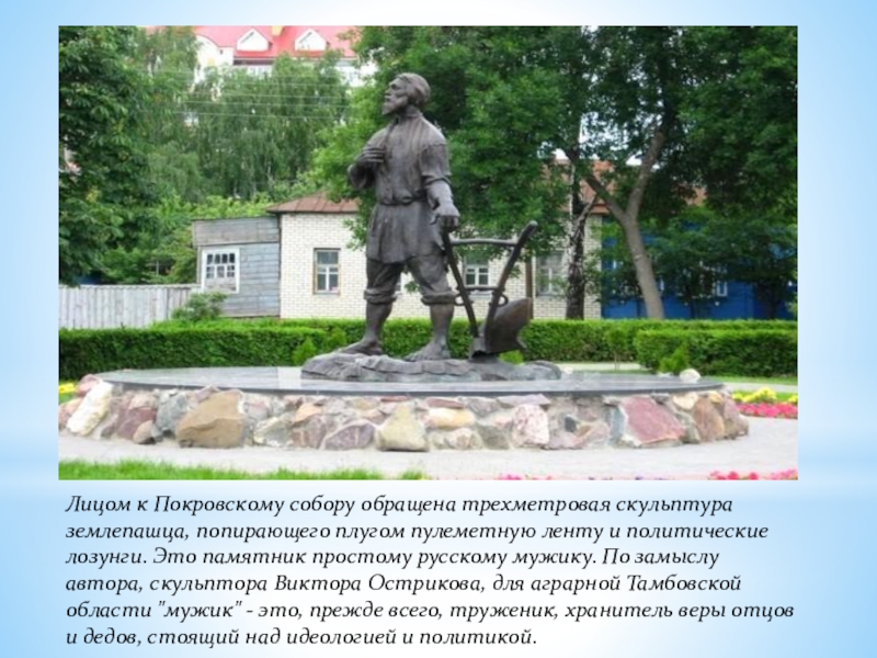 Слайд 11Лицом к Покровскому собору обращена трехметровая скульптура землепашца, попирающего плугом пулеметную