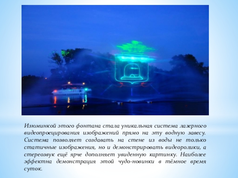 Слайд 23Изюминкой этого фонтана стала уникальная система лазерного видеопроецирования изображений прямо на