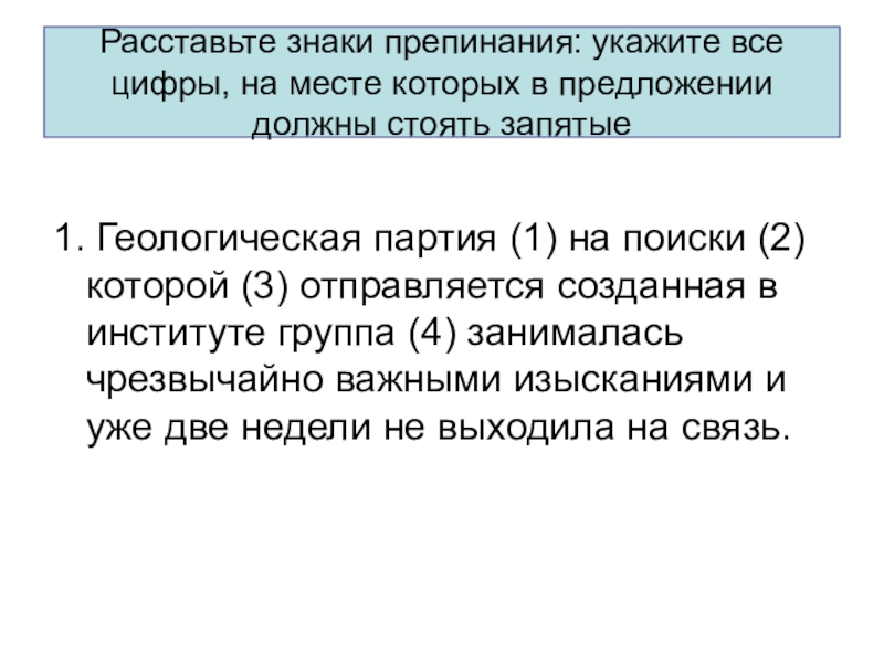 1. Геологическая партия (1) на поиски (2) которой (3) отправляется созданная в институте группа (4) занималась чрезвычайно важными изысканиями и уже две недели не выходила на связь.