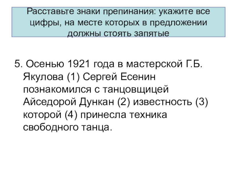 5. Осенью 1921 года в мастерской Г.Б. Якулова (1) Сергей Есенин познакомился с танцовщицей Айседорой Дункан (2) известность (3) которой (4) принесла техника свободного танца.
