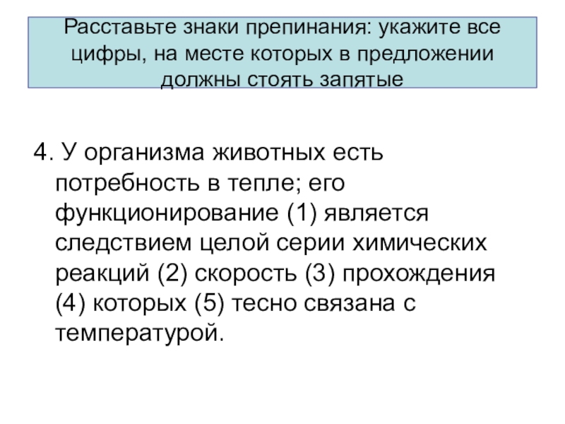 4. У организма животных есть потребность в тепле; его функционирование (1) является следствием целой серии химических реакций (2) скорость (3) прохождения (4) которых (5) тесно связана с температурой.