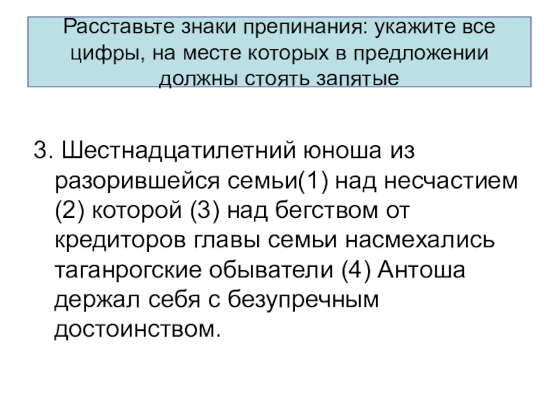 3. Шестнадцатилетний юноша из разорившейся семьи(1) над несчастием (2) которой (3) над бегством от кредиторов главы семьи насмехались таганрогские обыватели (4) Антоша держал себя с безупречным достоинством.