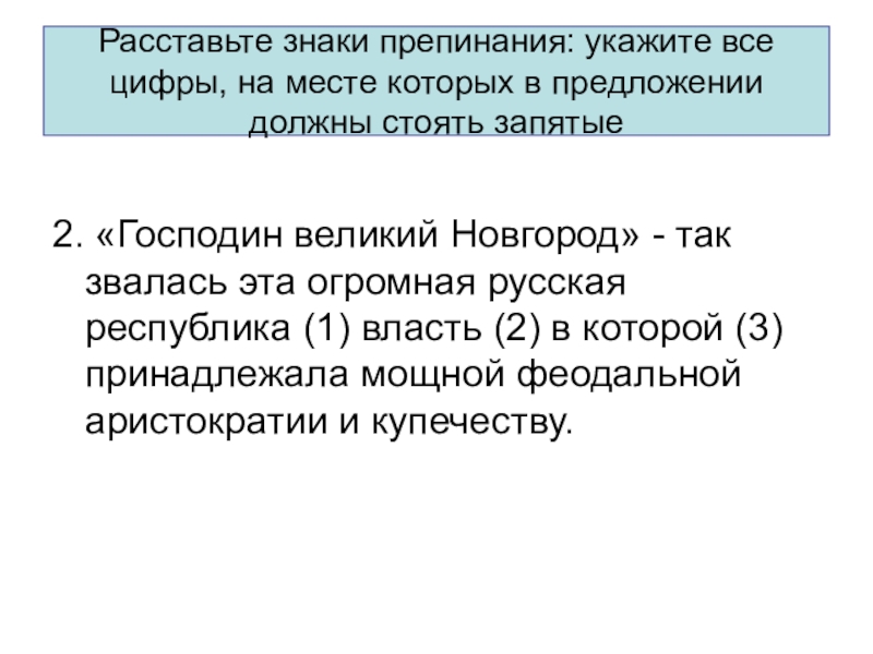 2. «Господин великий Новгород» - так звалась эта огромная русская республика (1) власть (2) в которой (3) принадлежала мощной феодальной аристократии и купечеству.