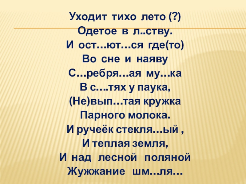 Уходит тихо лето (?)Одетое в л..ству.И ост…ют…ся где(то)Во сне и наявуС…ребря…ая му…ка В с….тях у паука, (Не)вып…тая