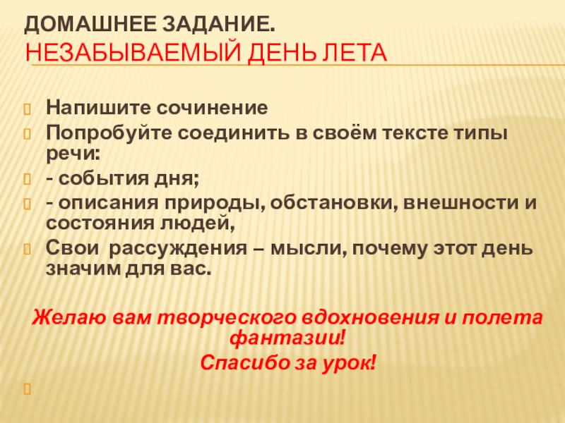 Домашнее задание.  Незабываемый день лета Напишите сочинение Попробуйте соединить в своём тексте типы речи:- события дня;-