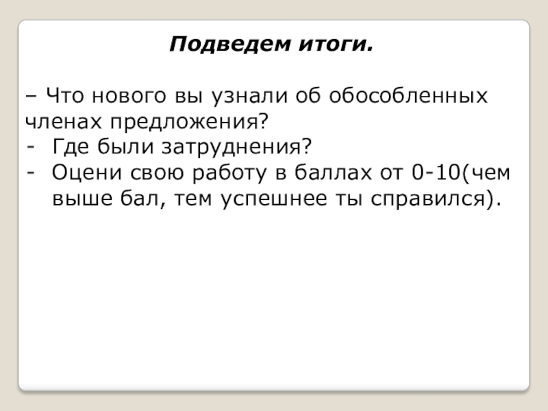 Подведем итоги.– Что нового вы узнали об обособленных членах предложения?Где были затруднения?Оцени свою работу в баллах от