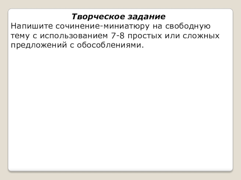 Творческое задание Напишите сочинение-миниатюру на свободную тему с использованием 7-8 простых или сложных предложений с обособлениями.