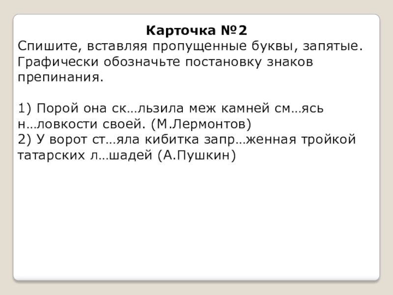 Карточка №2Спишите, вставляя пропущенные буквы, запятые. Графически обозначьте постановку знаков препинания.1) Порой она ск…льзила меж камней см…ясь