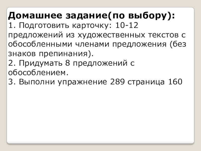 Домашнее задание(по выбору):1. Подготовить карточку: 10-12 предложений из художественных текстов с обособленными членами предложения (без знаков препинания).2.