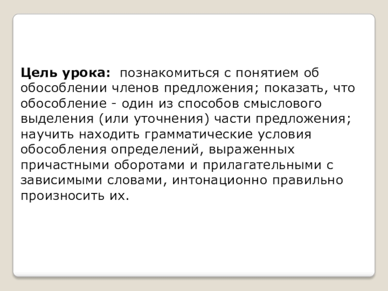 обособление - один из способов смыслового выделения (или уточнения) части предложения; научить находить грамматические условия обособления определений, выраженных причастными оборотами и прилагательными с зависимыми словами, интонационно правильно произносить их.