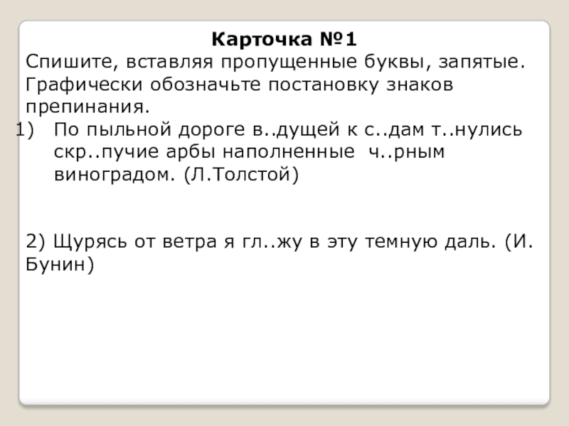 Карточка №1Спишите, вставляя пропущенные буквы, запятые. Графически обозначьте постановку знаков препинания.По пыльной дороге в..дущей к с..дам т..нулись