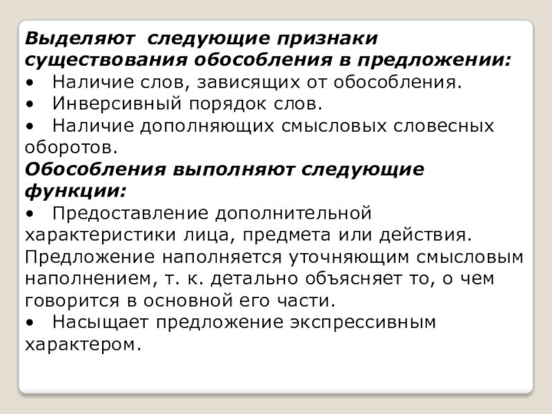 Выделяют следующие признаки существования обособления в предложении: •	Наличие слов, зависящих от обособления.•	Инверсивный порядок слов.•	Наличие дополняющих смысловых словесных