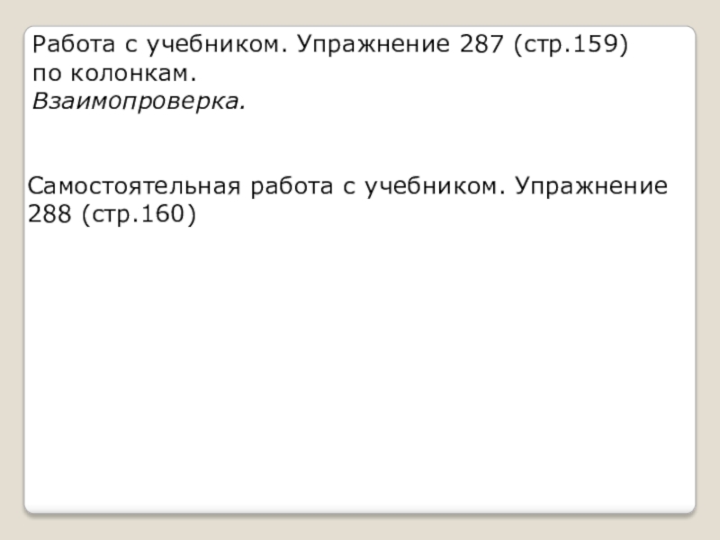 Работа с учебником. Упражнение 287 (стр.159) по колонкам. Взаимопроверка.Самостоятельная работа с учебником. Упражнение 288 (стр.160)