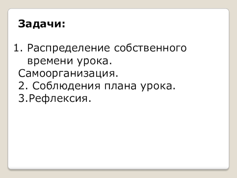 Задачи: Распределение собственного времени урока.Самоорганизация.2. Соблюдения плана урока.3.Рефлексия.