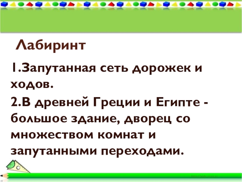 Лабиринт 1.Запутанная сеть дорожек и ходов.2.В древней Греции и Египте - большое здание, дворец со множеством комнат и запутанными переходами.