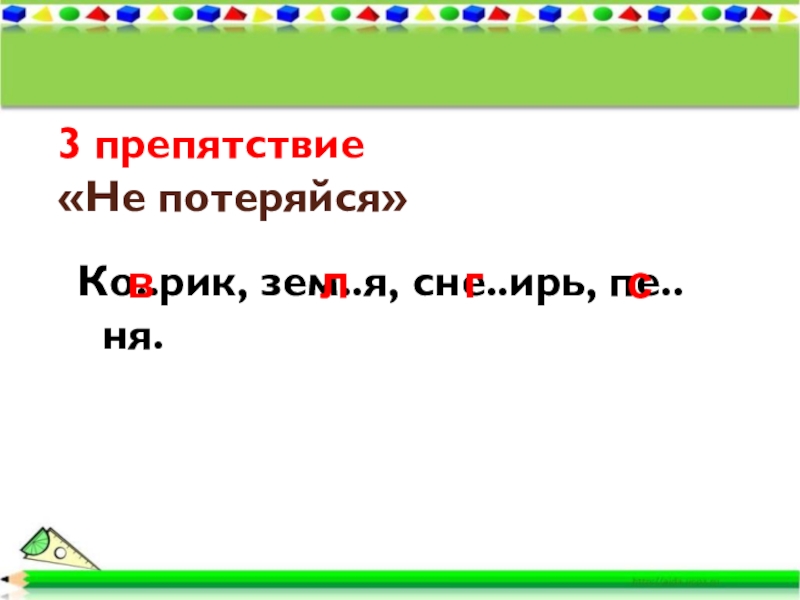 3 препятствие  «Не потеряйся»Ко..рик, зем..я, сне..ирь, пе..ня.влгс