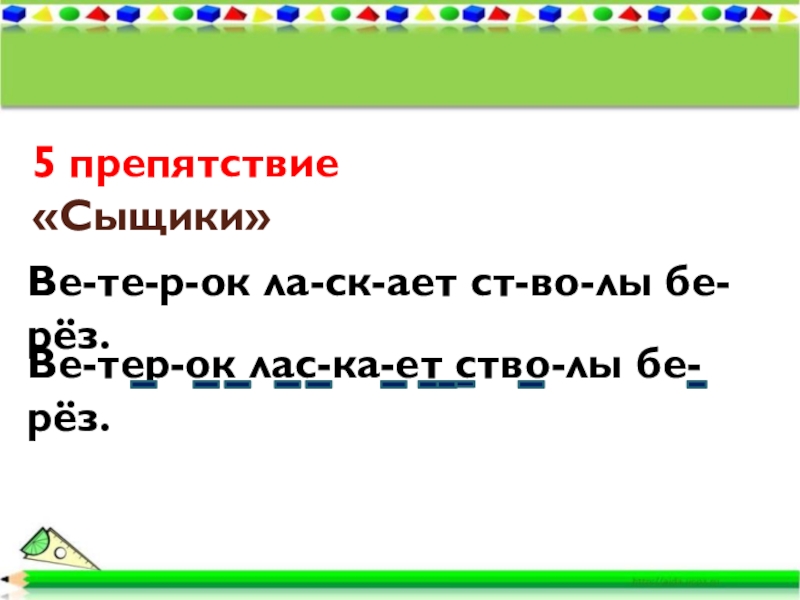 5 препятствие «Сыщики»Ве-те-р-ок ла-ск-ает ст-во-лы бе-рёз.Ве-тер-ок лас-ка-ет ство-лы бе-рёз.