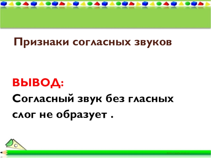 ВЫВОД:Согласный звук без гласныхслог не образует .Признаки согласных звуков