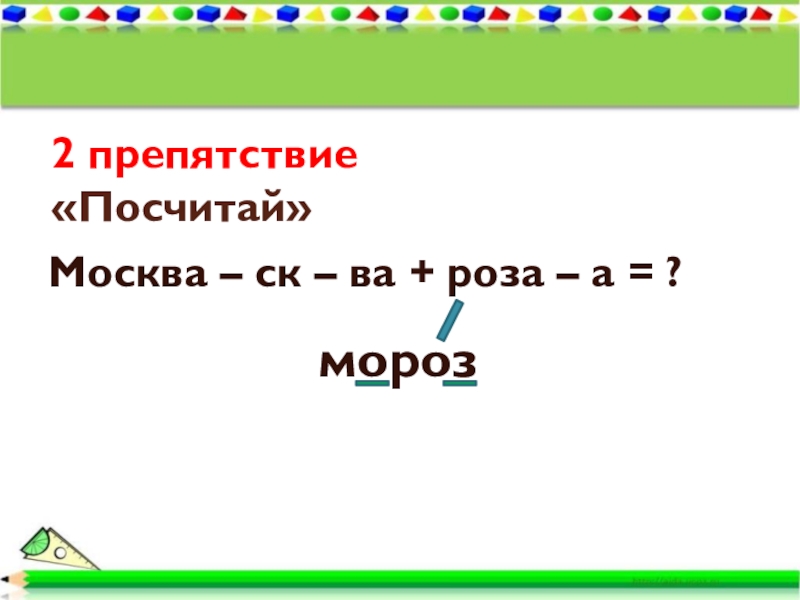 2 препятствие  «Посчитай»Москва – ск – ва + роза – а = ?мороз