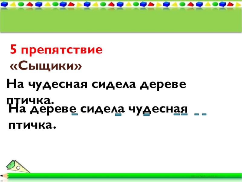 5 препятствие «Сыщики»На чудесная сидела дереве птичка.На дереве сидела чудесная птичка.