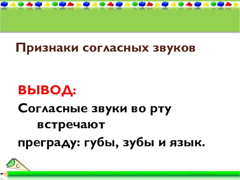 Признаки согласных звуковВЫВОД:Согласные звуки во рту встречаютпреграду: губы, зубы и язык.