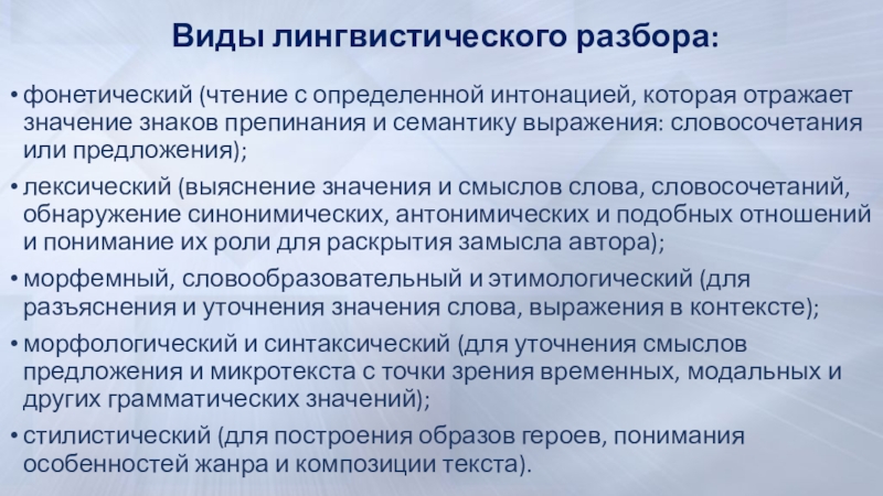 лексический (выяснение значения и смыслов слова, словосочетаний, обнаружение синонимических, антонимических и подобных отношений и понимание их роли для раскрытия замысла автора);