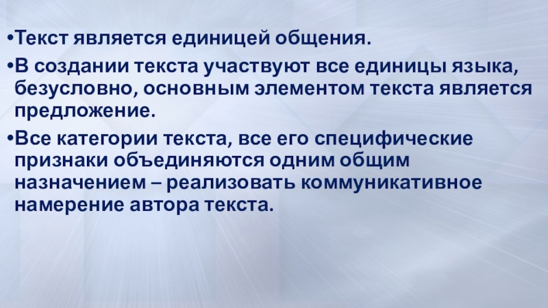 Все категории текста, все его специфические признаки объединяются одним общим назначением – реализовать коммуникативное намерение автора текста.