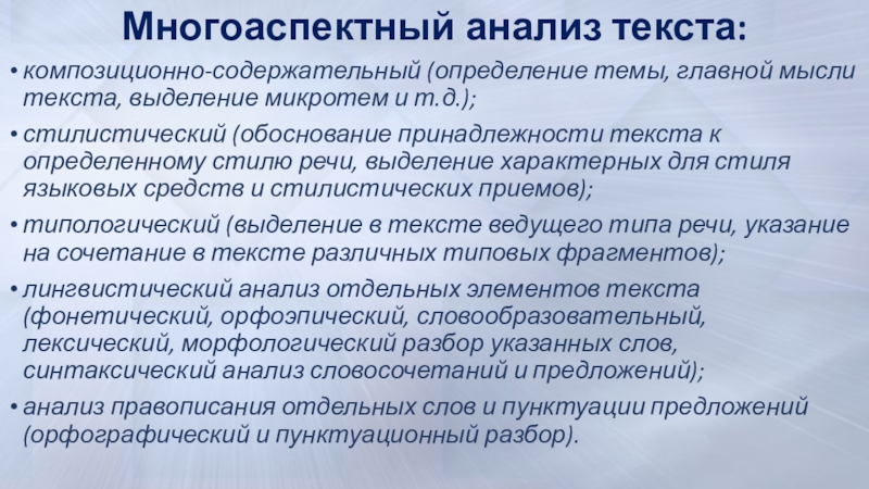 лингвистический анализ отдельных элементов текста (фонетический, орфоэпический, словообразовательный, лексический, морфологический разбор указанных слов, синтаксический анализ словосочетаний и предложений);