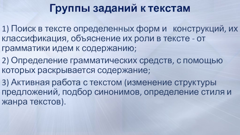 конструкций, их классификация, объяснение их роли в тексте - от грамматики идем к содержанию;
