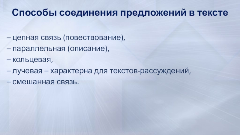 Синтаксические средства связи (порядок слов в предложении, синтаксическая неполнота, единство видо-временных форм глаголов-сказуемых, синтаксический параллелизм конструкций.