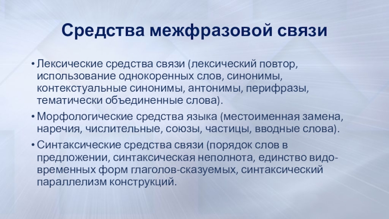 Морфологические средства языка (местоименная замена, наречия, числительные, союзы, частицы, вводные слова).