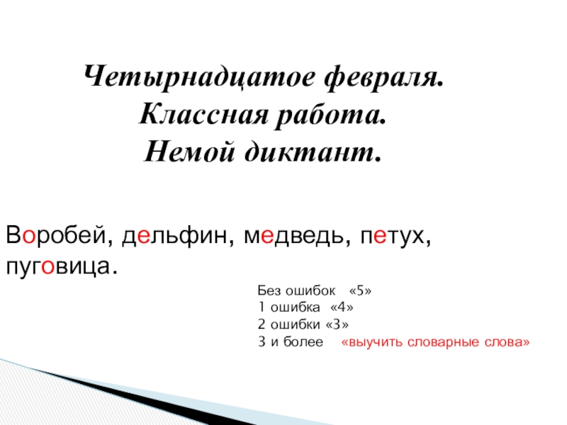 Четырнадцатое февраля.Классная работа.Немой диктант.Воробей, дельфин, медведь, петух, пуговица.  Без ошибок  «5»1 ошибка «4»2 ошибки «3»3