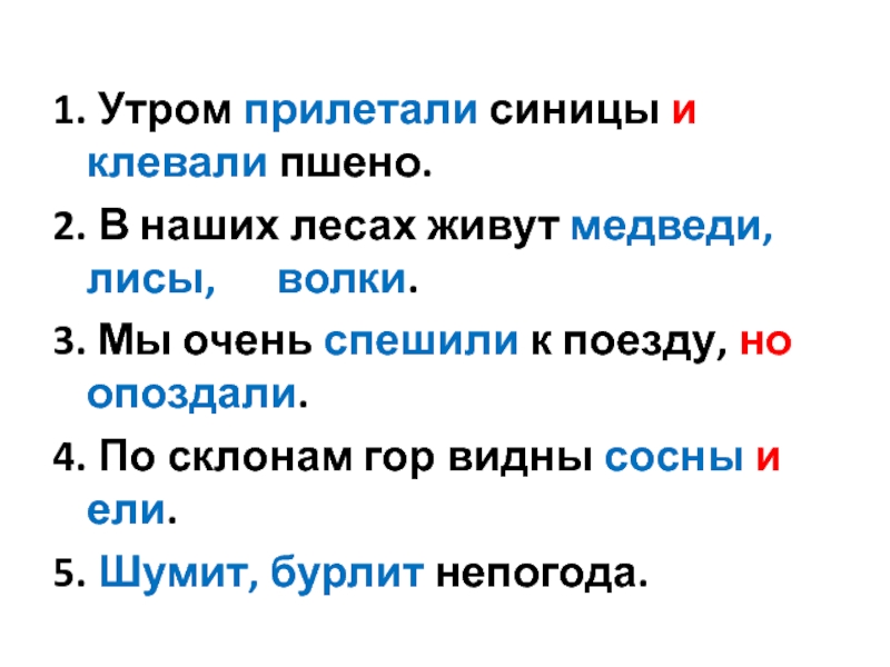 1. Утром прилетали синицы и клевали пшено.2. В наших лесах живут медведи, лисы,   волки.3. Мы