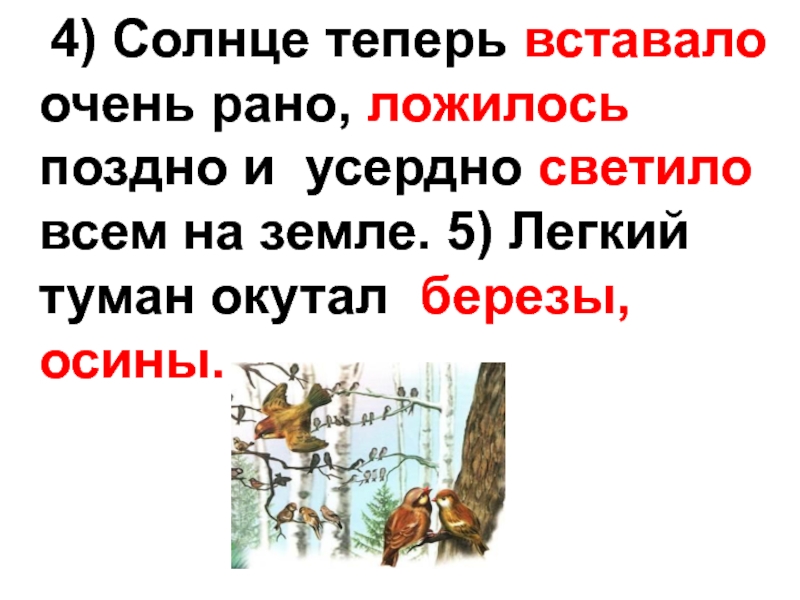 4) Солнце теперь вставало очень рано, ложилось поздно и усердно светило всем на земле. 5) Легкий туман