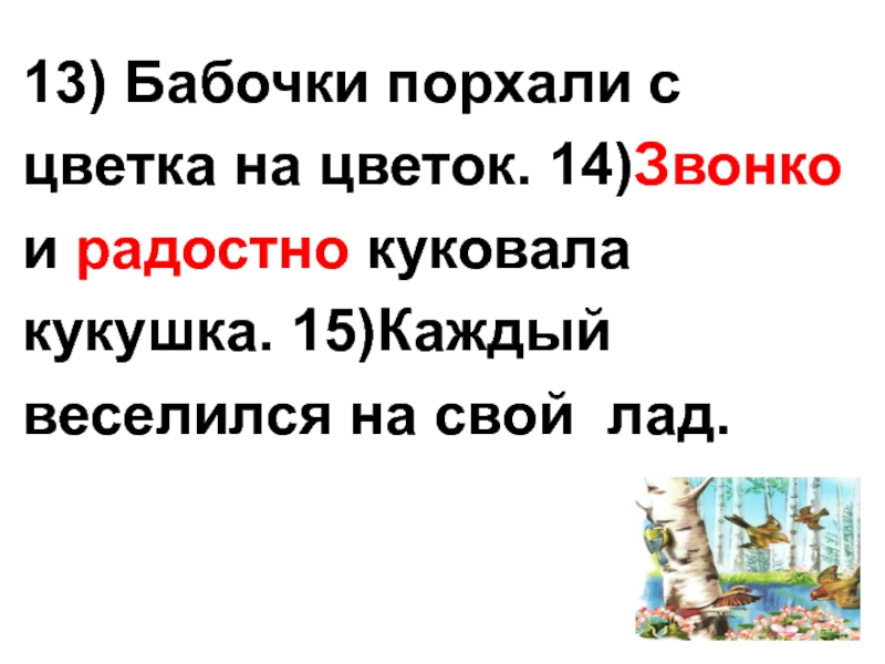13) Бабочки порхали сцветка на цветок. 14)Звонкои радостно куковалакукушка. 15)Каждыйвеселился на свой лад.