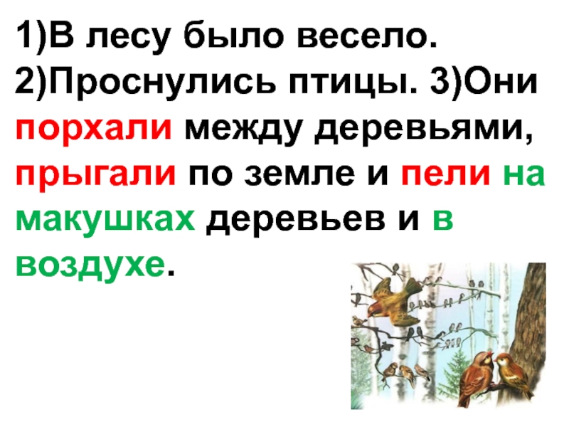 Слайд 18 1)В лесу было весело. 2)Проснулись птицы. 3)Они порхали между деревьями, прыгали по
